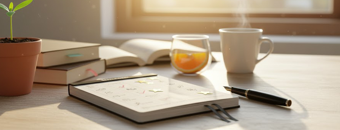 Journal with small tasks checked off Hands tending to a small plant, showing growth